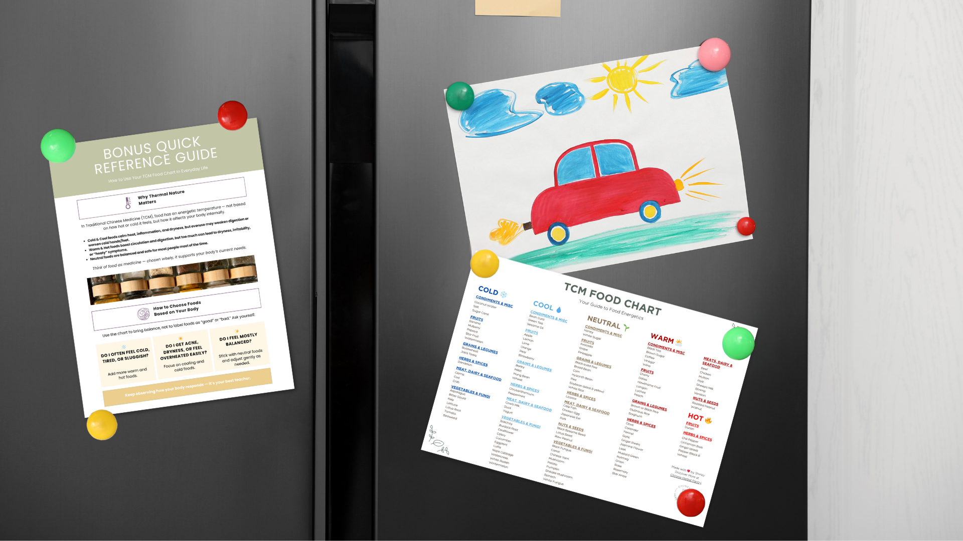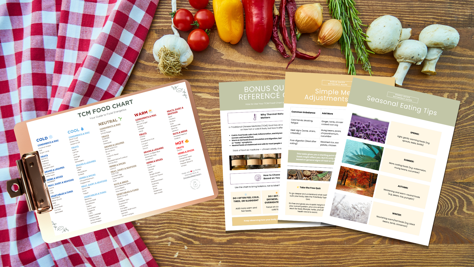 This beautifully designed TCM Food Chart is your everyday reference to understanding the thermal nature of over 150 common foods — from fruits and grains to herbs, meats, and spices — categorized into:
